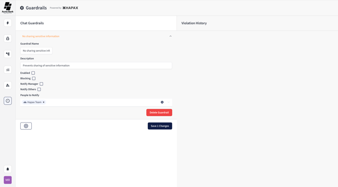 Guardrails are configurable safety and policy controls that help your institution manage how Hapax is used—especially when employees ask the AI Assistant questions or run workflows. When a Guardrail is triggered, Hapax can block the action, allow it but notify reviewers, or do both, depending on how you configure it.