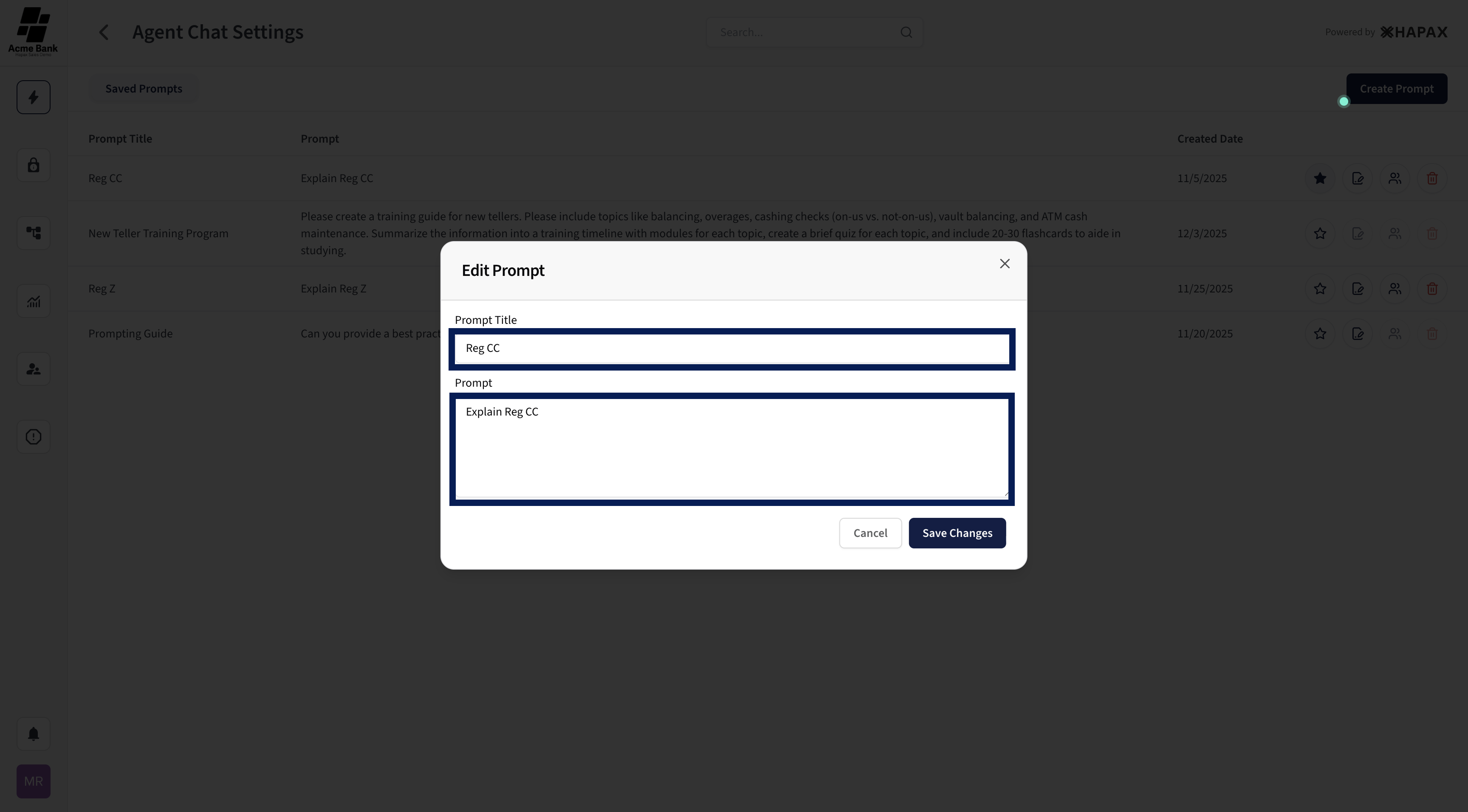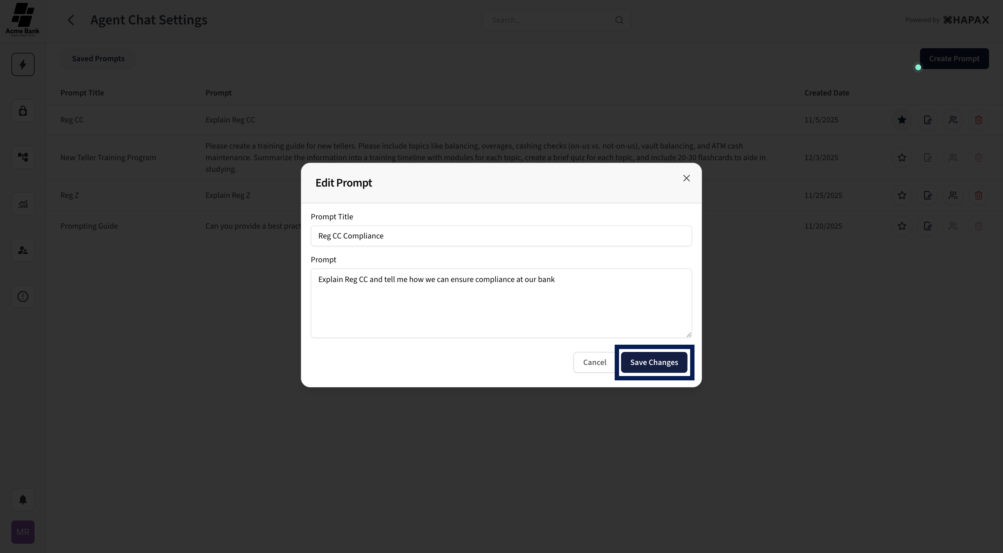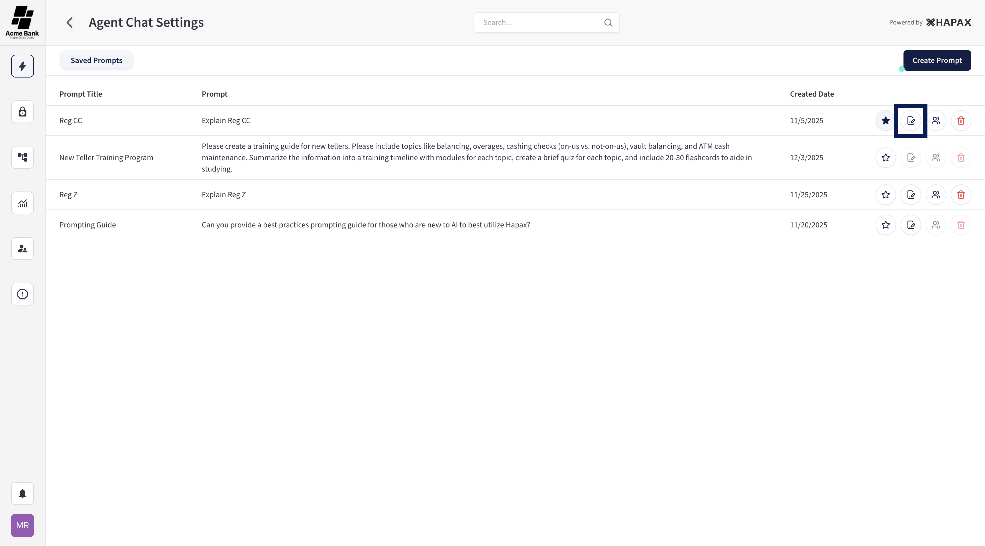 Editing a Saved Prompt allows you to quickly update the prompt name, text, or permissions without creating a new one. Follow the steps below to make changes to an existing prompt.